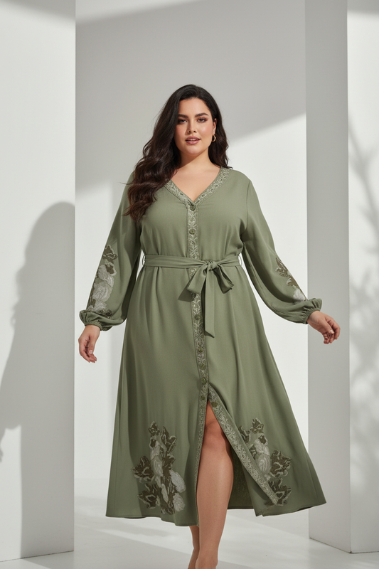 Vestido kaftán verde con bordados en blanco