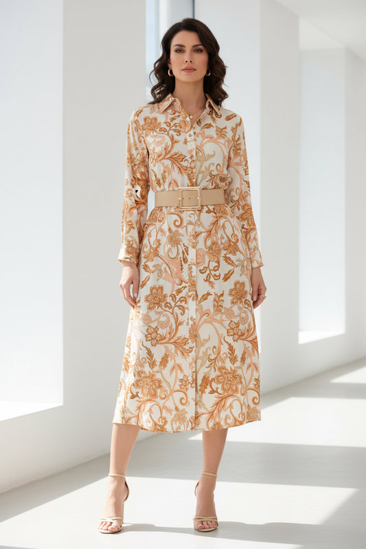 Vestido camisero estampado camel y salmón