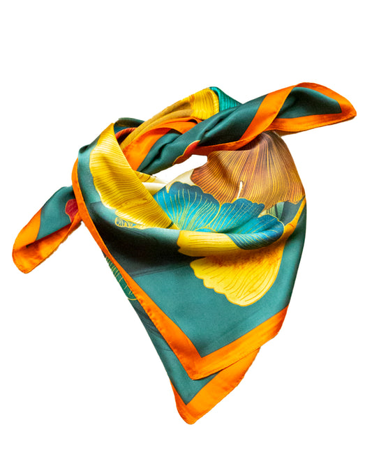 Pañuelo de seda con estampado botánico ginkgo sobre fondo turquesa