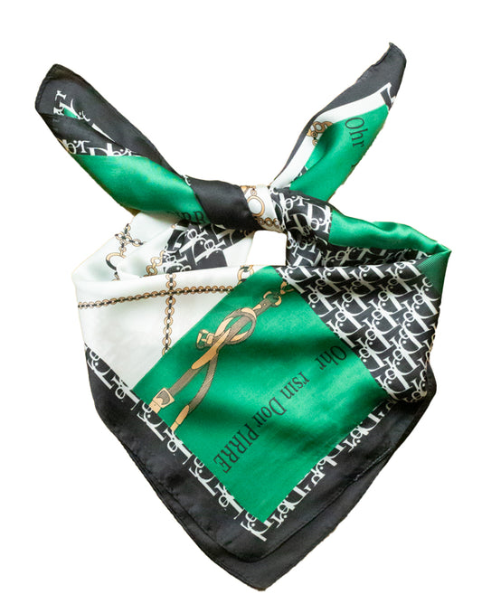 Pañuelo de seda con cadenas y detalles tipográficos verde