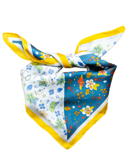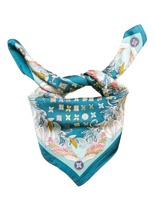 Pañuelo de seda con estampado barroco sobre fondo turquesa