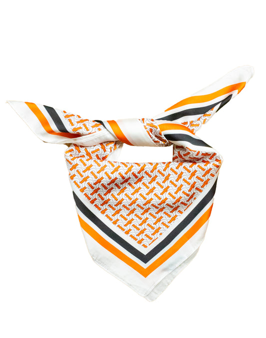 Pañuelo de seda con cadenas y detalles tipográficos naranja