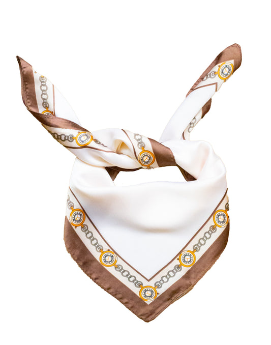 Pañuelo de seda con cadenas de inspiración ecuestre sobre fondo beige