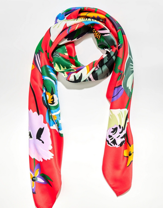 Pañuelo de seda multi flores fondo coral