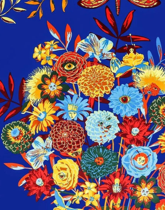 Pañuelo de seda jarrón de flores y caras azul eléctrico