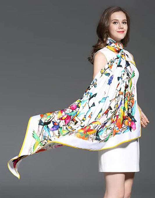 Pañuelo de seda colibrís blanco