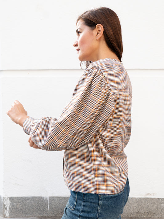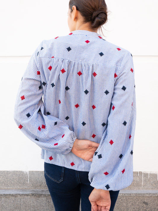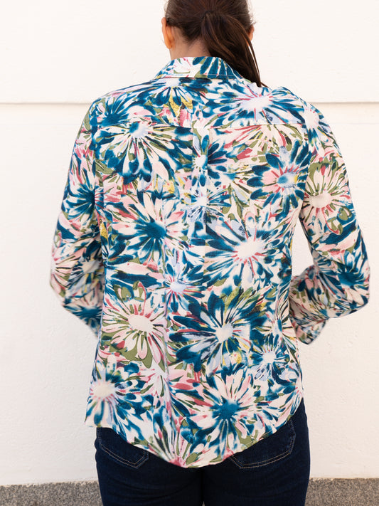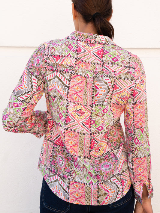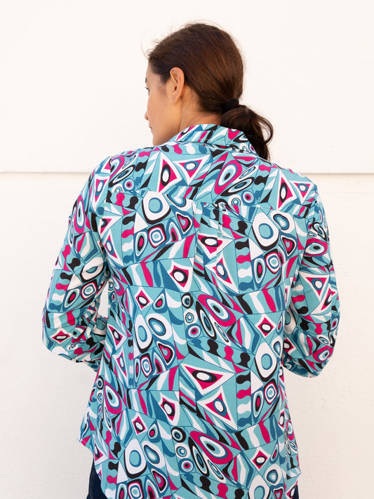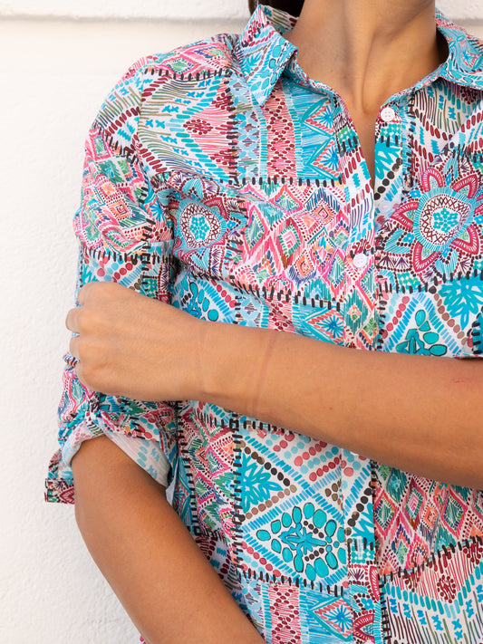 Camisa fluida clásica estampado patchwork azul turquesa y rosa