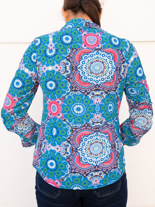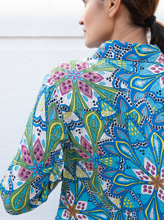 Camisa fluida clásica estampado mandalas azul turquesa y rosa