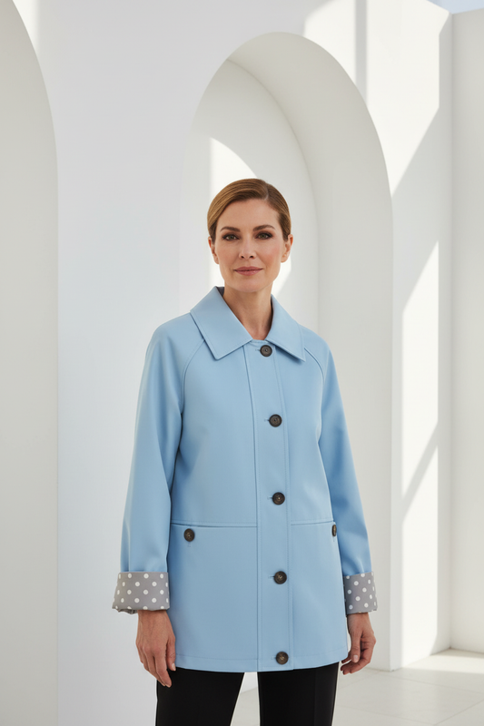 Gabardina recta azul clara con puños de lunares