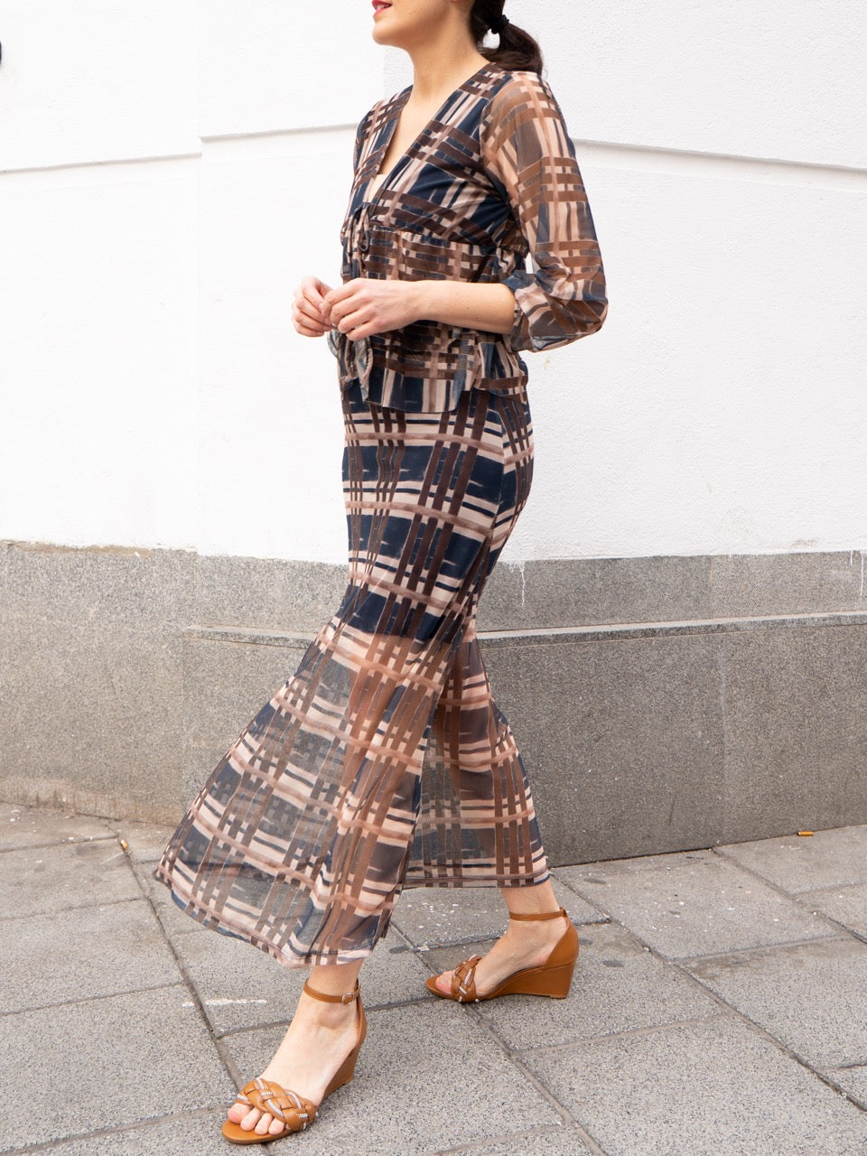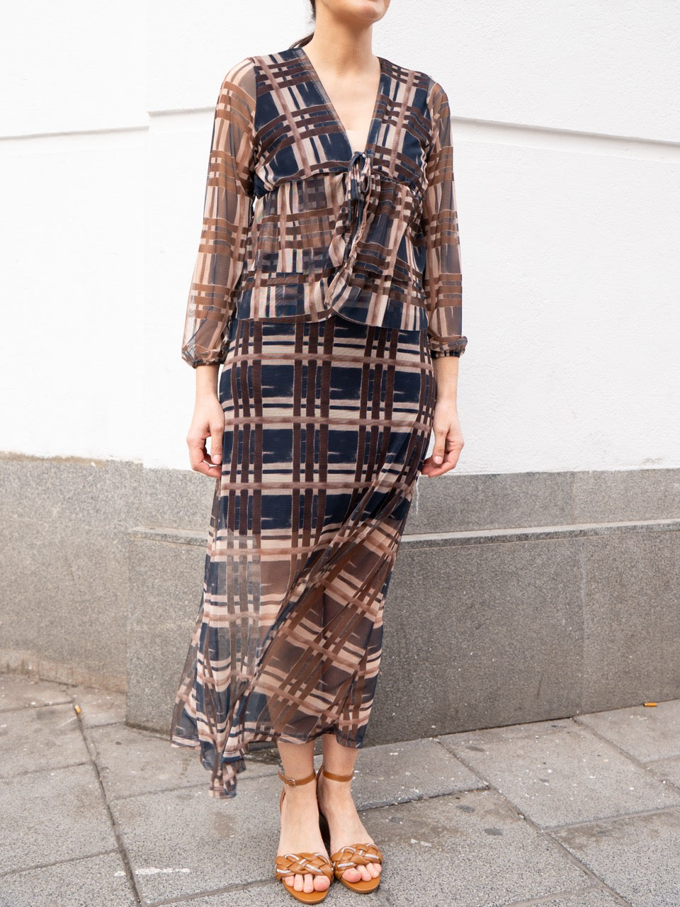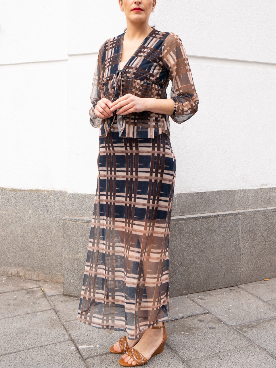 • Diseño transparente con cuadros tartán en tonos beige, marrón y azul marino